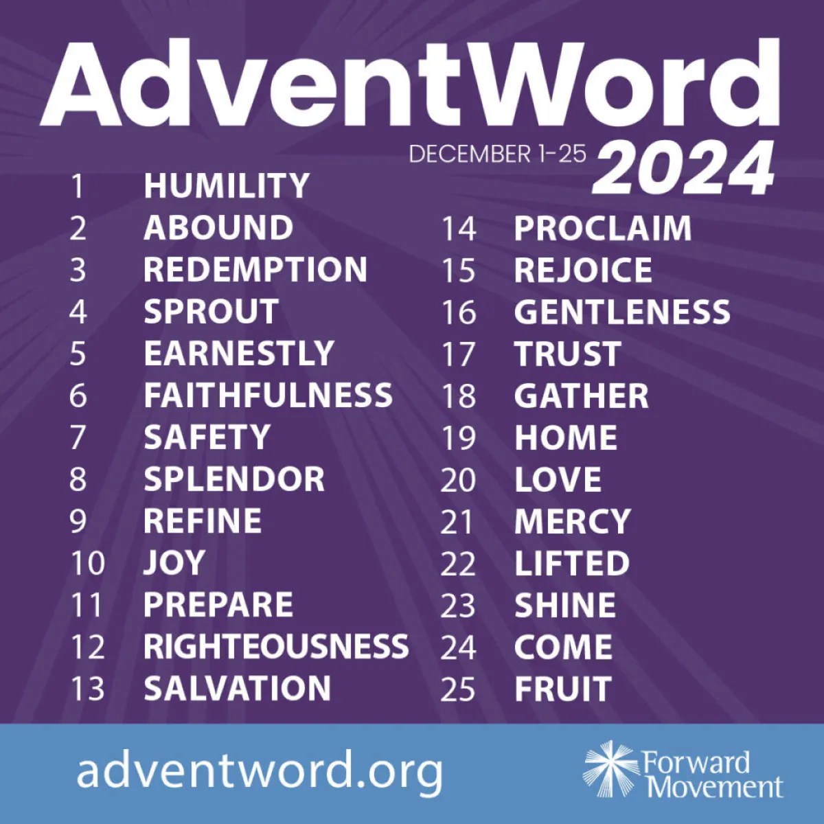 Forward Movement has announced the 2024 reflection words for AdventWord, an inspirational online Advent calendar featuring a daily prompt word selected from the Sunday Lectionary readings. Downloadable bulletin inserts and social media-friendly images are now available on our Resources page.